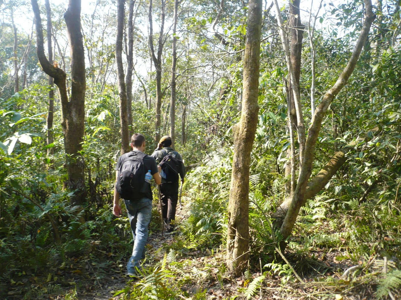 On se met en route, et à part quelques chevreuils qui gambadent, des singes qui sautent de branche en branche et une trallée d’oiseaux, on voit rien de sérieux pour la première heure. Quand on arrive à la délimitation entre la forêt et une clairière, on entend un CRAC assourdissant. On croirait que c’est une grosse boule de démolition qui vient de fracasser une cabane faite avec des 2 par 4. Ganesh met un doigt sur ses lèvres et nous invite à s’approcher d’où le bruit provient. On voit pas grand chose, avec la forêt assez dense et un gros brouillard matinal, mais soudainement on voit un énorme rhinocéros qui court perpendiculèrement à notre trajet, à dix mètres devant nous. Holy shit!
