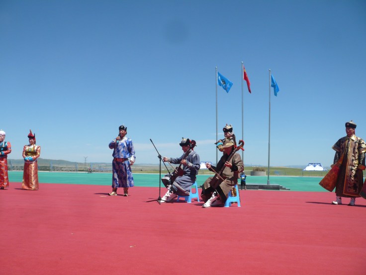 Je me rends à la cérémonie d’ouverture, à quelques centaines de mètres de la ville sur une grande plaza au milieu d’une plaine où ils ont érigé un stage. Des bonhommes en suit cravate et du monde habillés en vêtements traditionnels mongols font des discours et jouent de la musique avec des violons bizarres, puis boum, c’est le grand départ, et les cyclistes s’élancent sur la trail avant d’éventuellement disparaître au loin. Ils feront une autre étape par un chemin différent le lendemain matin, et le surlendemain après-midi, après la course à pied. Il y a deux crinqués mentaux qui vont faire les deux, la course de bicycles et le marathon, un Allemand et un Chinois.
