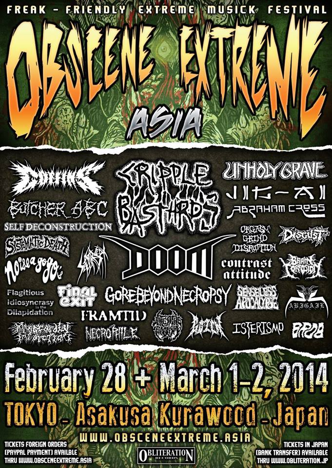 Le légendaire festival Obscene Extreme roulait déjà depuis une bonne quinzaine d’années, avec un rassemblement annuel de freaks, de punks croûteux et de fans de metal extrême à Trutnov en République Tchèque, quand son fondateur Tchurby a décidé d’expérimenter et d’exporter son produit. C’est ainsi qu’au cours des années 2014 et 2015, ils ont organisé des versions en Australie, au Japon, en Indonésie, au Mexique, à Los Angeles et à Montréal, certains avec un grand succès, et d’autres qui ont viré au désastre total. Je vous laisse deviner lesquels. Quand j’ai appris qu’il s’en venaient au Japon, j’étais tout fébrile et j’ai tout de suite acheté un billet, même si l’affiche était peu remplie de noms que je connaissais. Ce genre de choses m’a jamais arrêté, surtout quand l’organisateur est une valeur sûre à qui je peux donner carte blanche pour assembler une belle ribambelle de groupes de qualité, vieux et jeunes, très underground et plus connus.