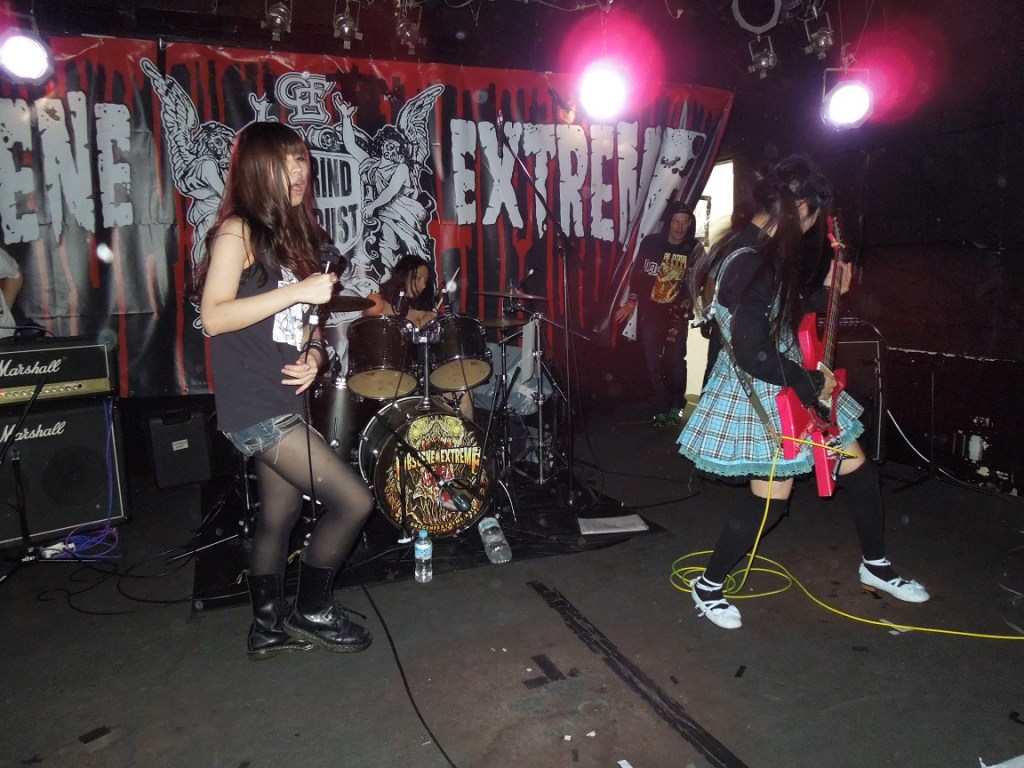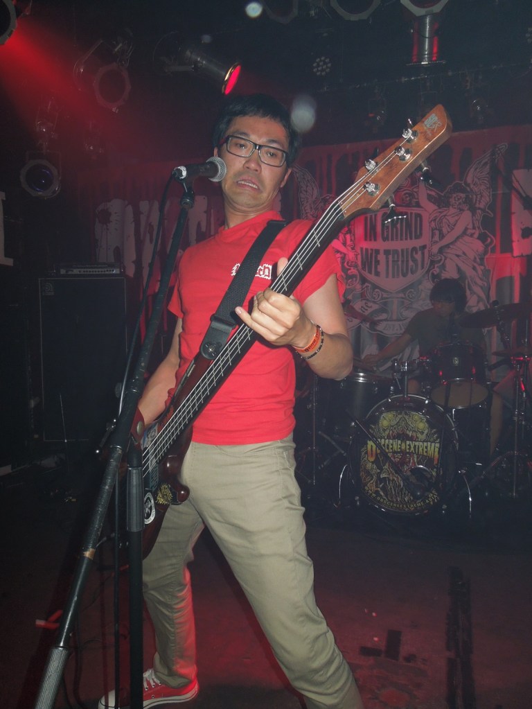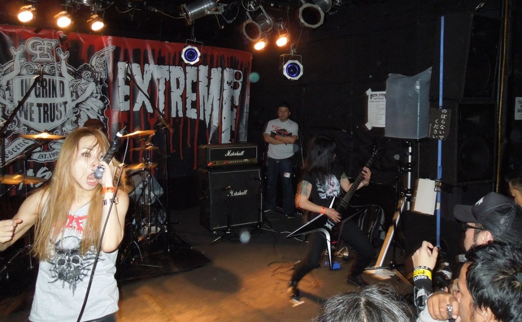 Donc après un vol budget de trois heures, j’arrive à l’aréoport régional d’Ibaraki, d’où je prends la navette vers downtown Tokyo. Mon vieux pote Jens est déjà à l’auberge et on se salue avec notre gros bro hug habituel suivi d’insultes mélangées en français, en allemand pis en anglais. On a peu de temps à tuer, parce que le fest commence en fin d’après-midi, dans une petite salle qui s’appelle le Asakusa Kurawood, située dans un petit quartier cute et tranquille. Comme d’habitude, approchant les lieux, on finit par juste suivre le monde avec des t-shirts noirs et des cheveux longs sales, et on croise trois grands tabarnaks qui s’avèrent être les grindeux de Jig-Ai, un des groupes européens qui seront de la partie. Tchurby est là avec son entourage, et on leur sert la main. Contrairement au OEF “normal”, qui est en plein air avec plusieurs milliers de festivaliers, cette fois on a droit à un petit fest en salle, plus intime, et donc plus d’accès aux musiciens et membres du staff.