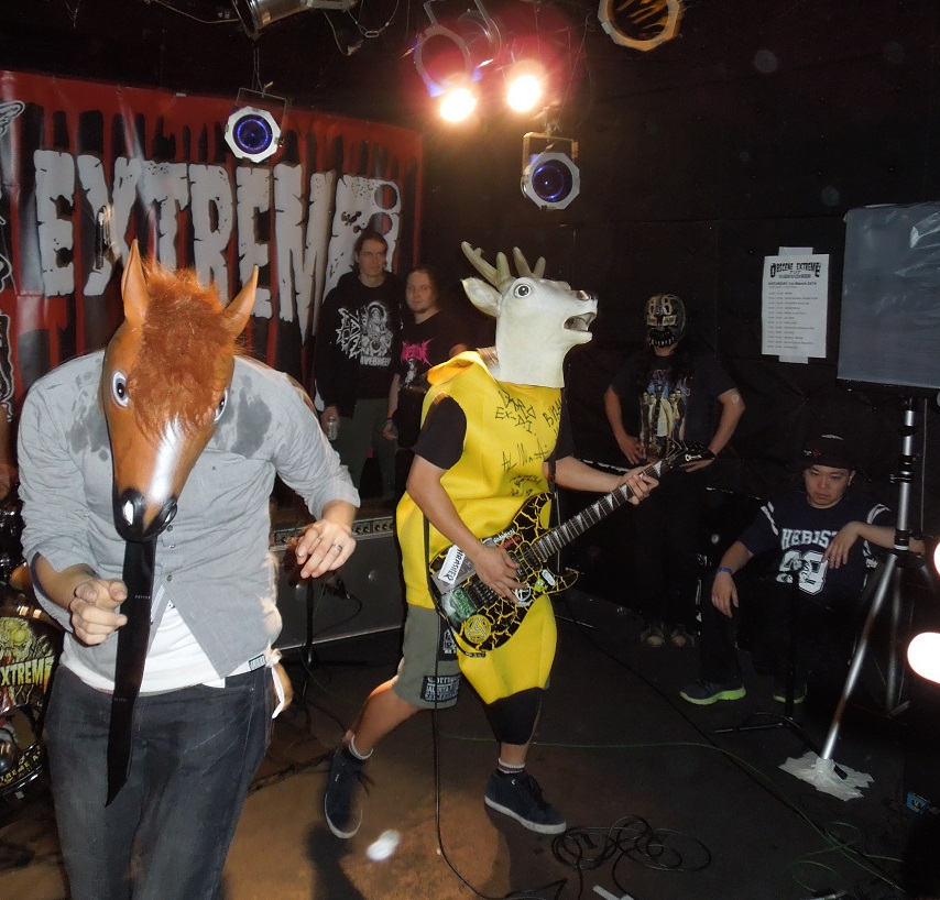 NOISE A GO-GO’S est le side-project un peu niaiseux de Gore Beyond Necropsy, qui seront de la partie le lendemain. Cinq bonhommes dans la cinquantaine, habillés avec des vêtements flamboyants des années 50, genre Elvis et tout ça, et qui jouent un mélange bizarre de vieux rock n’roll de cette époque, de disco, avec tellement de distortion que ça en vient noise des fois. Un Obscene Extreme en est pas un sans bands loufoques, et GO-ZEN continuent dans cette veine, groupe de goregrind dont le guitariste a un costume de banane et une tête de chevreuil en rubber alors que le bassiste est habillé en écolier mais sans pantalons. Puis c’est le tour de FINAL EXIT, un groupe qualifié de grind-noise, des tounes de 15 secondes garrochées à bout de bras avec un constant grichement et des paroles qui semblent juse consister de “Blablablablablaaaaaaahhh!!!” crié à plein poumons. C’est spécial, et assez intéressant de voir à quel point ils poussent leur son vers l’extrême et l’anti-musique, mais pas mon show préféré de la journée disons.