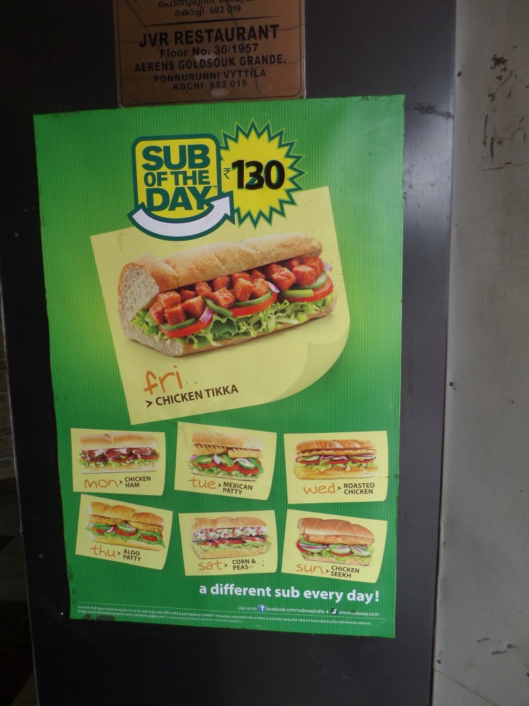 10- Leur menu de Subway, comme on peut s’imaginer, est pas mal différent de par chez nous. pas de porc, pas de boeuf, pas de fromage. J’ai pas eu la chance d’essayer, mais j’ai mangé une pizza Domino’s à Madurai.