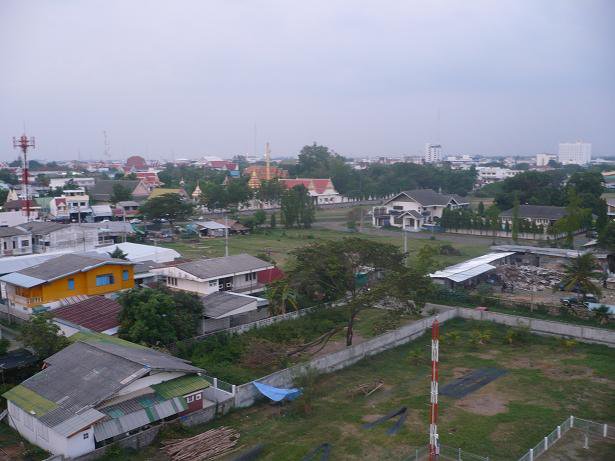 Je monte ensuite dans le bus pour Surin drette quand il s’apprête à partir, et le chauffeur me laisse mettre mon bicycle dans la cage sur le toit sans payer d’extra. Quelques heures plus tard, je suis en ville. Il me faut un certain temps pour pogner mes repères, et juste avant qu’il fasse noir, je prends une chambre dans un hôtel de style chinois très bon marché, mais agréable et situé au centre. J’explore un peu le coin, et je tombe sur un chantier de construction badass, c’est un de mes passe-temps préférés que d’aller dans ces places et défier le danger. Y a un bonhomme dans la cabine à l’entrée, je lui demande si je peux y aller, il semble plutôt surpris non seulement par ma présence, mais par mon existence même, et comprend pas vraiment ce que je demande. Difficile de lui en vouloir. Il ramasse un trousseau de clés et me conduit à la tour juste à côté de celle en construction, où il me pointe l’escalier et me dit de monter au dernier étage. Pas tout à fait l’aventure de chantier à laquelle je m’attendais, après toutes les fois où j’ai grimpé des grues ou des escaliers de buildings pas finis, mais j’ai une belle vue de la ville, des environs et du stade de football universitaire où se joue actuellement un match. Je demande au gentil monsieur si c’est une tour de téléphone, et il répond que c’est quelque chose d’autre que j’arrive pas à comprendre avec mon thaï limité. La carte sur le mur de l’hôtel me dit gentiment plus tard qu’il s’agit d’une tour de contrôle de la qualité de l’air. Ah bin.