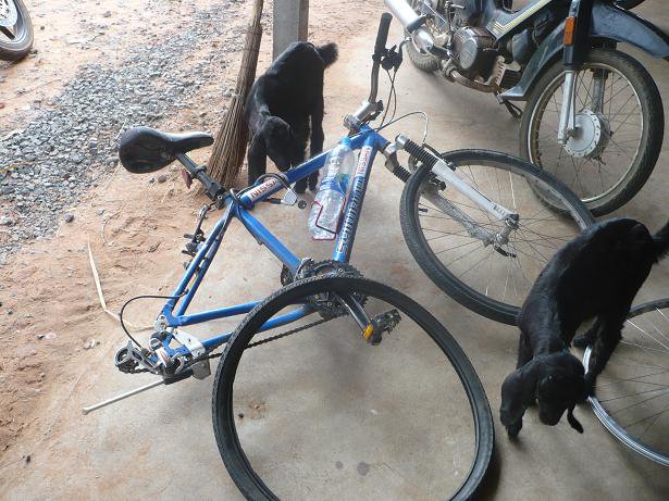 Le gars de bicycles dit que je devrais en fait acheter un pneu extérieur neuf, pas juste remplacer la chambre à air, et qu’ils en ont pas de ce rayon en stock. Il le rafistole avec du duct tape du mieux qu’il peut, mais dit que je devrais acheter un autre pneu dès que j’atteins une ville plus grande. C’est du moins ce que j’ai compris, car il parlait juste thaï, comme 100% des gens avec qui j’ai interagi durant les dernières 48 heures. J’ai pas bin le choix, alors je vais essayer, et après avoir fait mes adieux et un gros merci au monsieur qui m’a aidé, je suis de retour sur la route, à essayer d’éviter les bosses et nids-de-poule qui pourraient scrapper mon pneu.
