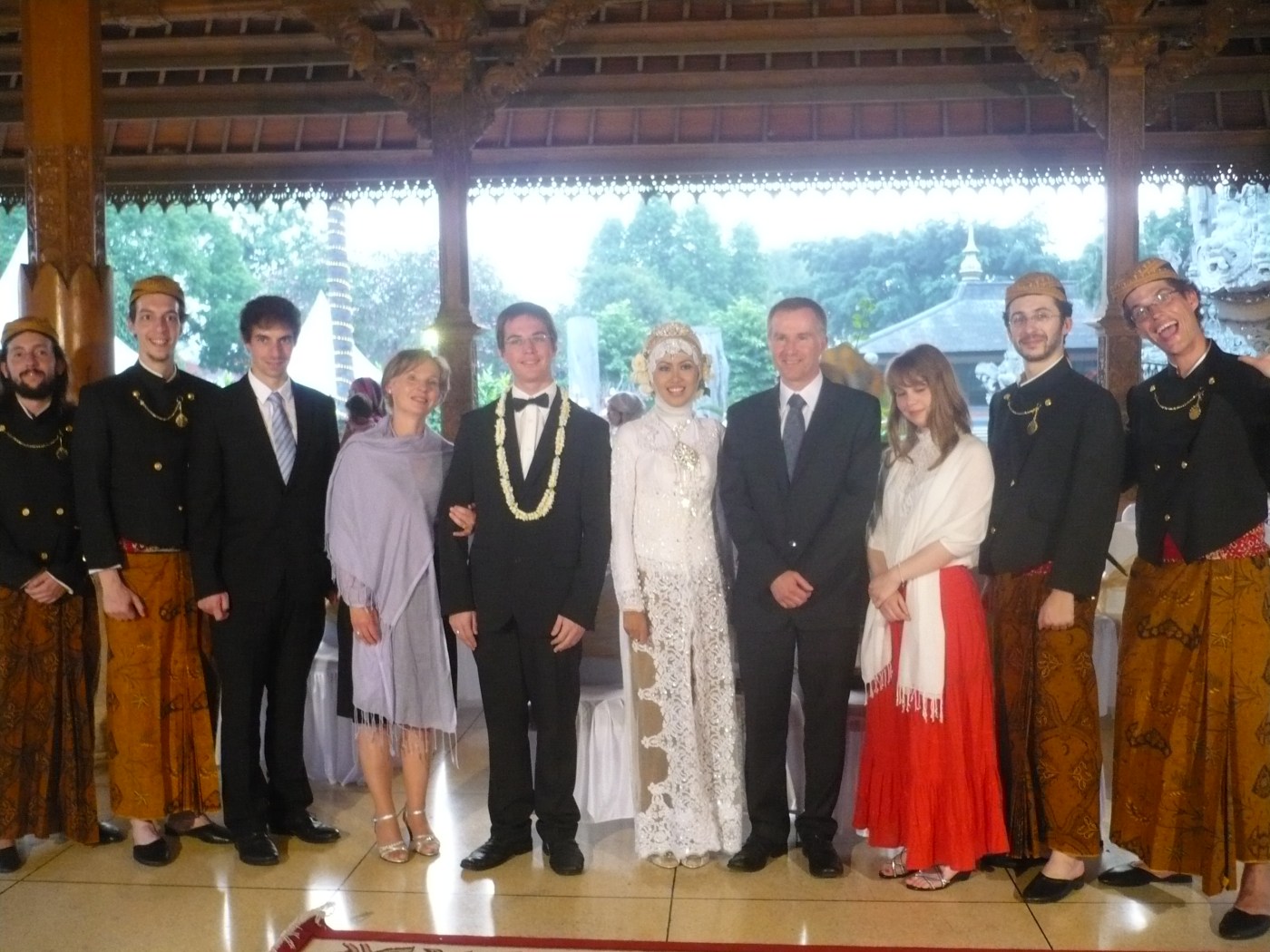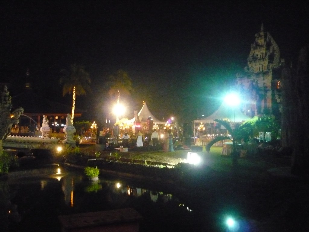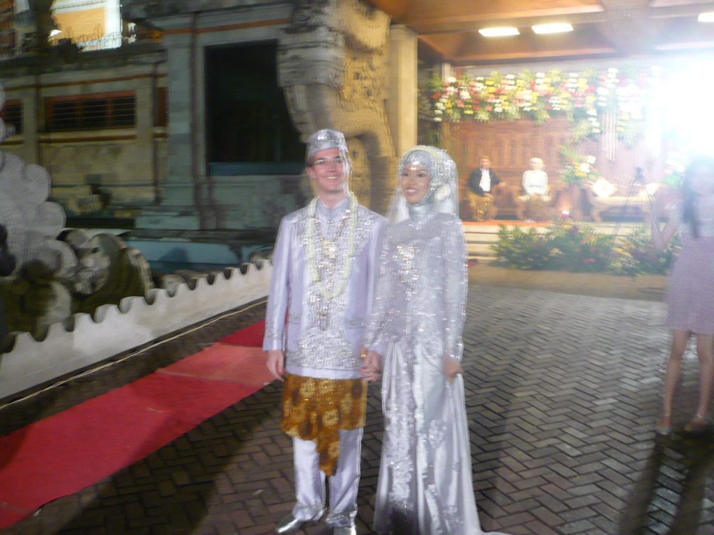 Ensuite les tourtereaux vont se changer pour quelque chose d’un peu plus confortable, et le festin commence. Une troupe de musiciens commence à jouer des beats sur des gros xylophones en bois et on mange dans le jardin, après s’être servi à un buffet. C’est délicieux, mais comme le note le père de Romain, il manque un peu de vin. Un des Français échafaude un plan pour aller en chercher dans un dépanneur (l’Indonésie est à majorité musulmane mais l’alcool s’y vend) mais finalement on laisse tomber, mieux vaut respecter les coutumes de la place et éviter de froisser nos généreux hôtes.
