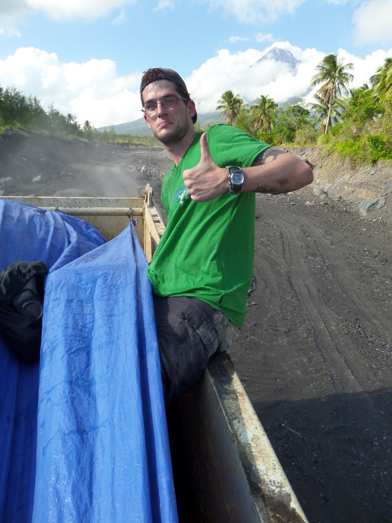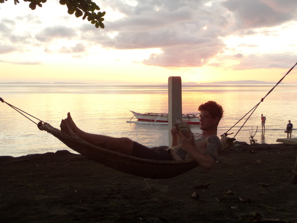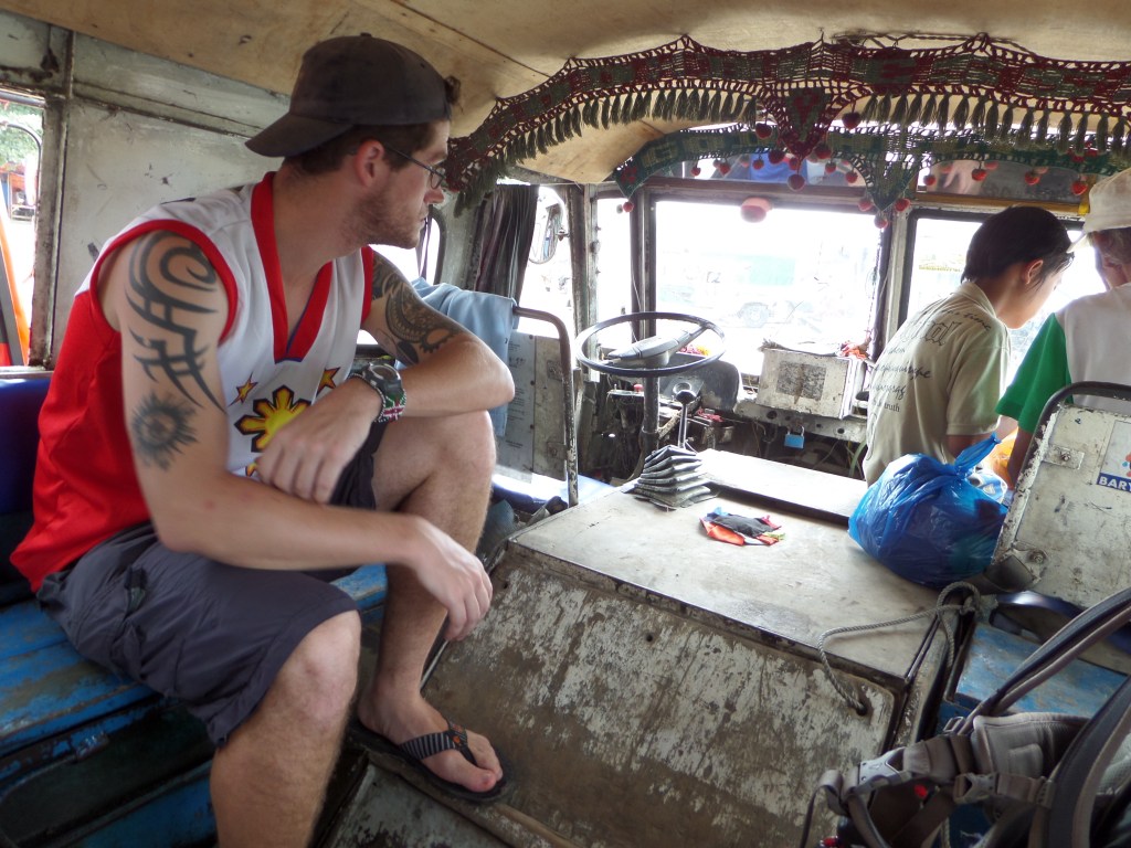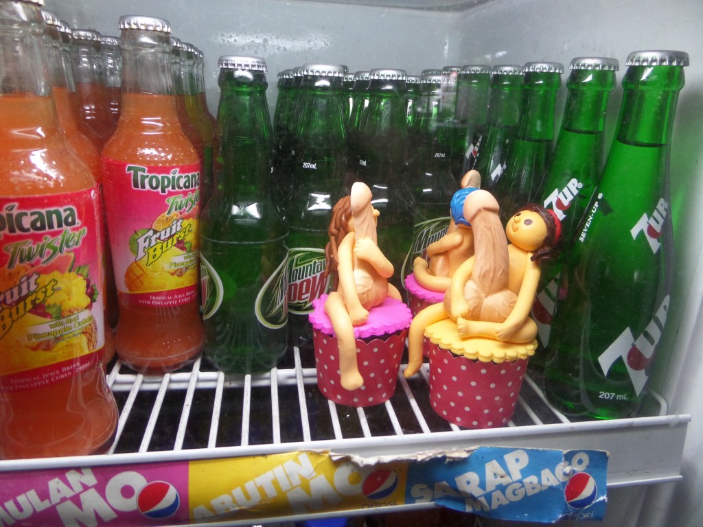 1- Pas loin du paradis sur Terre, ça. Et pour environ 5$, tu peux aller faire une petite croisière avec un de ces bateaux, qui t’emmène dans les îles à l’horizon faire de la plongée. (El Nido, Île de Palawan)2- Les trois demoiselles en provenance de Manille, qui nous ont accompagnés lors d’une de ces petites croisières. Elles furent de bonne compagnie.3- À jouer au ballon avec les gamins du coin. Ils sont habitués aux blanchâtres, dans ce lieu si touristique, mais étaient pas mal éberlués par la présence de mon compagnon Afro-Américain. “He’s a basketball! He’s a basketball!” s’exclama l’un des plus petits, à l’hilarité générale.4- Manille est pas mal dénuée de lieux touristiques intéressants. Cette vieille forteresse espagnole est sur la liste mais fait pas mal pitié.5- Dans ce cas-là, ce qu’il faut faire est se promener et absorber l’ambiance de l’endroit. Ainsi, tu peux tomber sur des scènes de rue assez spéciales, genre ce salon de barbier.6- Daet, sur la côte Pacifique de l’Île de Luzon. Les Philippins viennent y faire du surf. J’ai eu l’idée très conne d’aller nager là et je remercie Jésus de m’avoir laissé revenir sur la berge.7- Des gâteaux grivois dans le frigo de notre hôtel8- De la viande de crocrodile. Je pourrais pas vraiment commenter sur le goût et la texture, c’était haché et mélangé avec beaucoup de piments. 9- On a grimpé ce volcan (pas jusqu’au cratère évidemment, mais pas mal haut, un méchant défi avec la chaleur accablante et la cendre noire lousse) et on a retourné en ville sur le pouce, dans la benne de ce gros camion.10- La belle vie. Faut savoir relaxer des fois hein?11- À Masgate, les moto-taxis sont tous jaunes. C’est rigolo.12- En attendant que le jeepney se mette en route.13- Le tarsier, petit singe creepy aux gros yeux rouges globuleux, habitant de l’Île de Bohol14- Ils aiment leur basketball là-bas. On a joué quelques parties bien endiablées avec les jeunes du coin.