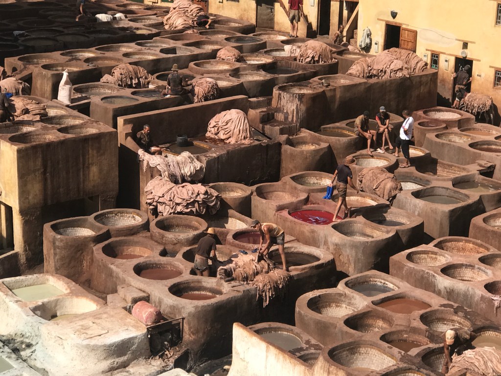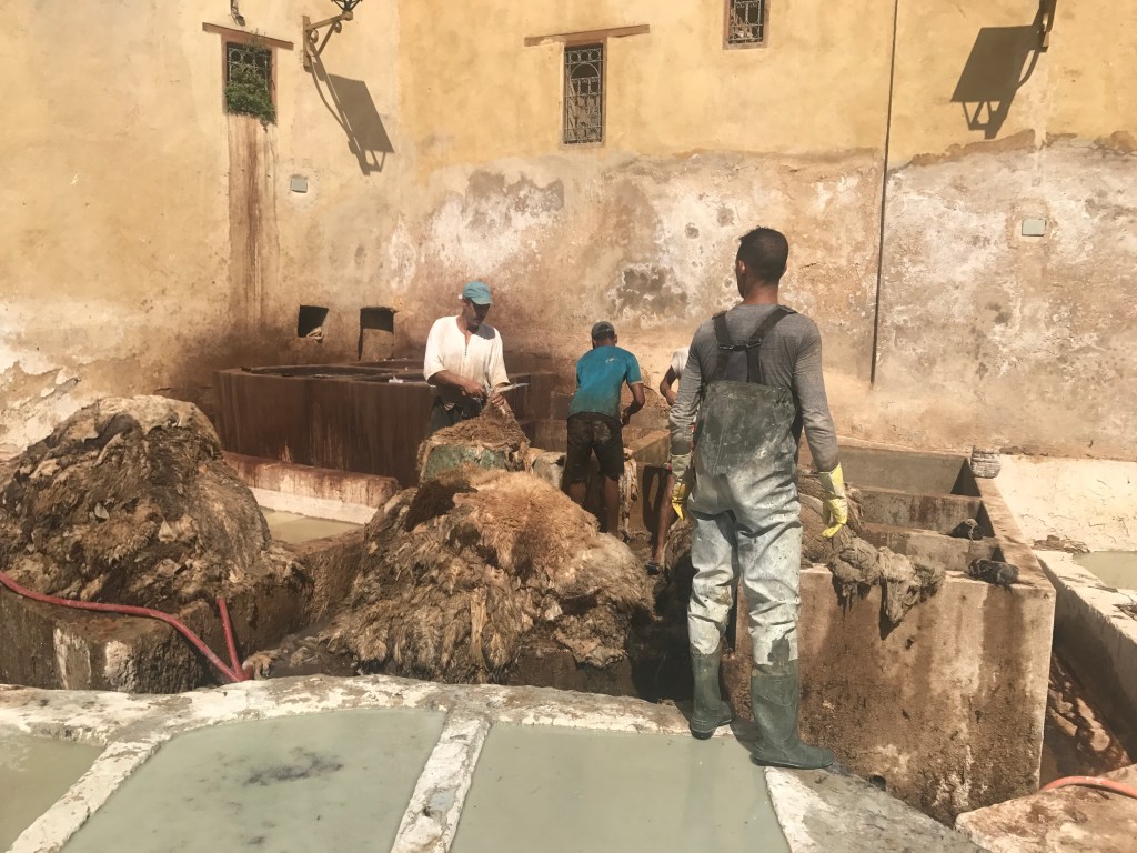 On décide donc qu’ils sont dignes de confiance et on les suit. Ils nous montrent les pits en forme de demi-sphère, remplis de liquide bouetteux, où les peaux de vaches macèrent. Ça les attendrit, à force d’un processus chimique, et après une durée de temps, des ouvriers les sortent de là avec un crochet et vont les étendre sur une poutre de bois avant de les battre à coups de bâton. Après avoir demandé et reçu la permission du monsieur, je grimpe sur la plateforme avec les pits pour prendre une photo, et j’entends un call en arabe derrière moi, probablement “Tasse-toé sti”. Un grand gaillard tout de muscles et nerfs, nu-pieds et en bédaine et vêtu juste d’un pantalon baggy, passe à la course à côté de moi. Il transporte une pile de peaux qui a l’air horriblement pesante, et rendu à la bordure, il la lâche à terre avec un FLAC assourdissant.