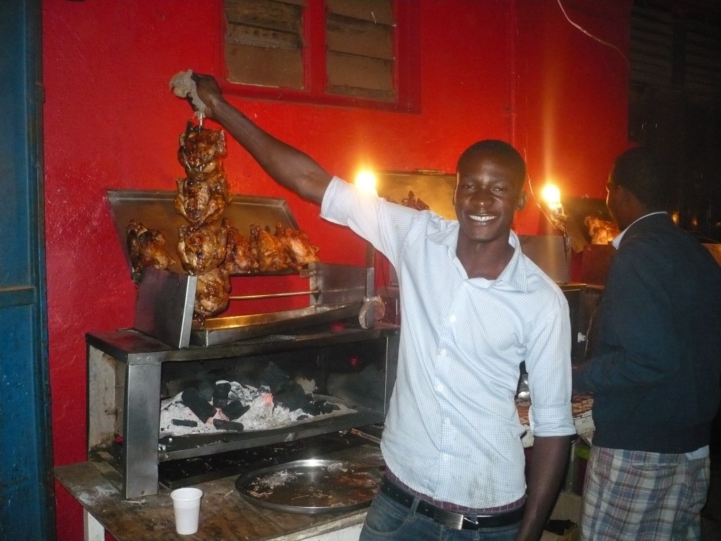 Un gars fait rôtir du poulet un peu plus loin, et l’odeur apportée par le vent me tue, y faut que je l’essaie. Enfin de la nourriture assaisonnée! Les brochettes de bœuf de l’après-midi étaient juste l’apéritif. Le gars coupe un demi-poulet en bouchées, qu’il mélange avec des oignons et du pain chapati frit qui grésille dans la graisse qui dégouline de la grille. Je sais pas si c’est à cause du contraste après des semaines de poulet bouilli insipide, mais c’est un des meilleurs plats de volaille que j’aie eu depuis très, très longtemps.
