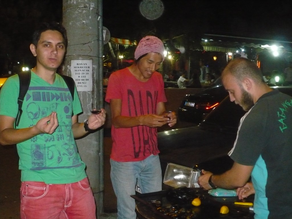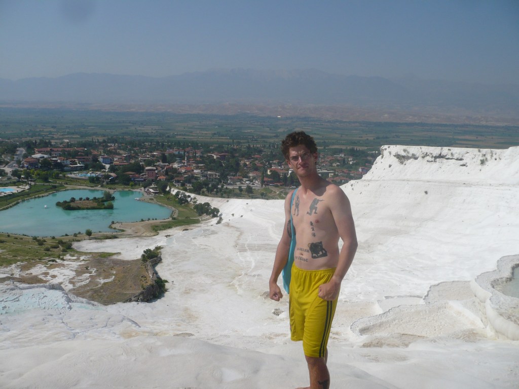 1- Vue sur Trabzon, de l’hôtel cheapo où je restais dans un quartier industriel.2- J’étais là durant le Ramadan, donc tous les clients assis à ce café ont une table vide devant eux! 3- Le soir, ça s’animait en maudit, avec concerts, bouffe de rue, jeux pour enfants, tout ça. 4- Un monastère à flanc de montagne, une heure en dehors de Trabzon.5- Les petites rues pittoresques d’Antalya. Les vendeurs de souvenirs étaient polis et pas fatiguants, et les deux petits gars m’ont demandé tout excités de jouer au soccer avec eux, ce que j’ai fait.6- Il y a des ruines grecques, romaines ou byzantines en masse là-bas si c’est de quoi que tu aimes bien. 7- J’ai loué un bicycle et chus allé me perdre loin en campagne.7- La grand-môman de mon hôte de CouchSurfing faisait cuire des galettes savoureuses.8- 10 ans plus jeune, plus de cheveux, moins de barbe, moins de tattoos et moins de bédaine de bière, à poser à Pamukkale, cette formation géologique fascinante avec ses piscines de calcaire. 9- La bouffe en Turquie était SUPERBE. Là mon ami local et mon ami coréen mangent du riz cuit dans une coquille de moules.10- J’ai eu une escale de quelques heures à Izmir, c’était une ville bien jolie.11- Rue piétonnière commerciale bien bondée, sur le côté est de Istanbul. Les adolescents qui s’accrochaient au tramway en marche avaient pas froid aux yeux.12- Hagia Sofia, quelle superbe architecture.13- Et ça c’est la Mosquée Bleue, vue de loin. Magnifique.