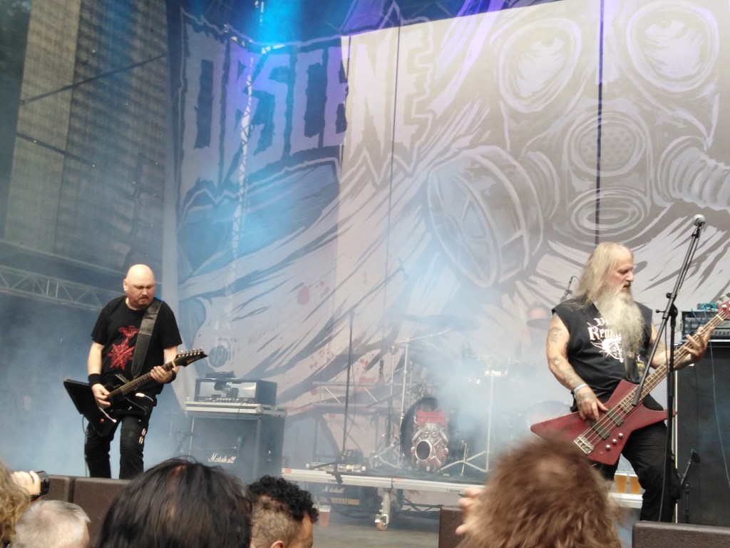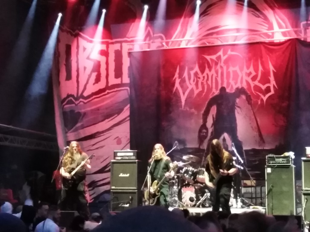Dans la même veine de groupes de death metal européens qui commencent par V, qui roulent depuis longtemps, qui sont encore pertinents et qui ont pas tout à fait acquis le statut de légendes mais sont considérés comme des respectables vétérans, voici VOMITORY. Après une longue pause, ces Vikings ont droppé le foutument bon album All heads are gonna roll il y a quelques mois et sont là pour le défendre sur les planches. Et… c’est de la putain de daube. Je me souviens de les avoir vus au OEF 2012 et j’avais trouvé ça aussi ennuyant que regarder de la peinture qui sèche, et là l’expérience se répète. Les pièces sont du death suédois de haute volée comme il ne s’en fait plus et sont interprétées avec haute compétence, mais calvaire qu’ils savent pas donner un show. Après chaque track, au lieu d’enchaîner à la suivante, ils se retournent sans un mot et vont se reposer autour de la batterie, ce qui brise le rhythme comme quand il faut que tu arrêtes mi-baise pour aller répondre au téléphone. Je comprends qu’ils se la jouent “Scandinave stoïque qui laisse sa musique parler par elle-même”, OK certes, mais il y a moyen de faire ça sans sembler se foutre de la gueule des fans. Le growl sec d’Erik Rundqvist est plus mince qu’un petit filet d’eau, et c’est même pas lui qui s’adresse à la foule, mais le colossal guitariste qui a autant de charisme qu’une boîte de carton. En tout cas, vous avez saisi, il y a une grosse liste de groupes que j’écouterai jamais en album mais dont j’aime les prestations live, et Vomitory est un des rares cas pour qui c’est l’inverse. J’ai quand même apprécié quelques moments, comment ne pas headbanger sur Chaos Fury, mais en gros je suis plus déçu qu’autre chose.