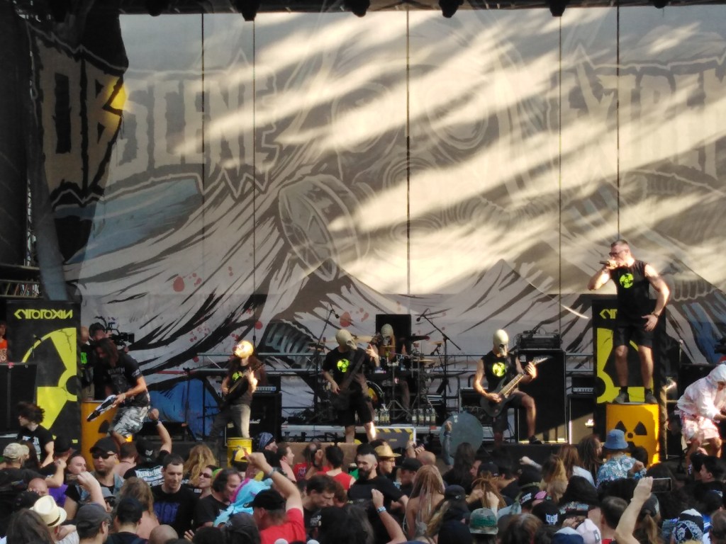Trève de chiâlage, revenons à nos moutons. La position du soleil commence à faire un peu d’ombre près de la scène, et un nombre croissant de péquenots s’approchent pour voir UNIDAD TRAUMA de Tijuana et leur goregrind mid-tempo d’inspiration médicale. Drette après ça c’est un des groupes j’ai le plus hâte de voir, HYPERDONTIA, qui fait des grosses vagues dans le sous-genre du death metal caverneux, que j’affectionne énormément et qui se fait un peu rare sur le terreau du Obscene Extreme! La formation mi-danoise mi-turque nous fait entrer en transe avec leurs riffs pesants et lugubres, je suis aux premières loges avec quelques nouveaux potes dont des gars de Depraved, on lève nos poings et on fait des babounes quand un sublime changement de tempo survient. Mon rêve est d’un jour aller au Killtown Deathfest à Copenhague, où ce genre de death caverneux fait la loi.