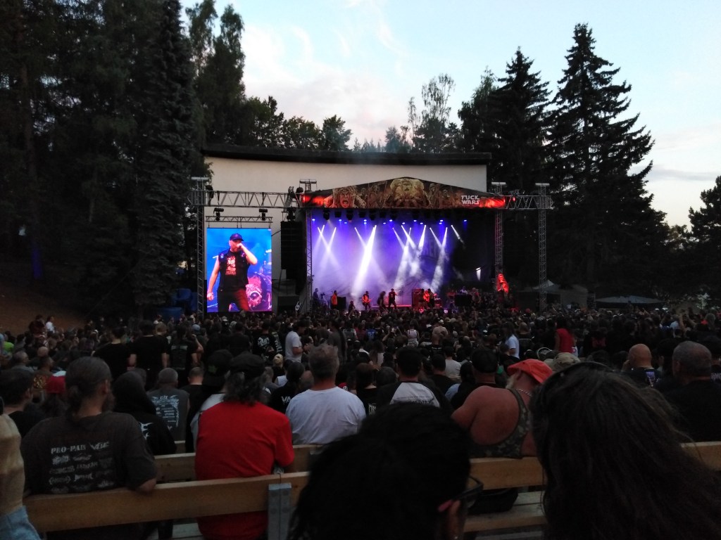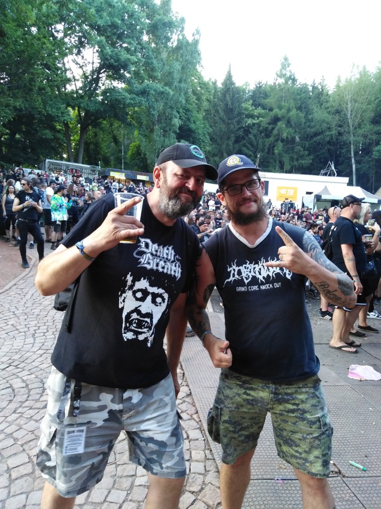 …ce qui fait que j’apprécie le set du clou de la soirée, les über-légendaires CARCASS, d’autant plus! Le son est superbe, la facture visuelle minimaliste mais évocatrice est là, et les stage-divers sont en feu. Je suis pas le plus gros fan de Carcass, oui tsé je connais Carcass vaguement et j’ai écouté la discographie, mais attendez-vous pas à un setlist entier de ma part. Je sais juste qu’ils ont sensiblement mis l’emphase sur leur vieux matériel (Genital Grinder, Keep On Rotting, Corporal Jigsore Quandary, etc.) mais fini ça avec un Heartwork de derrière les fagots. J’ai vaguement entendu des rapports au cours des dernières années comme quoi Carcass commencent à le perdre mais ils étaient au sommet de leur forme en ce beau jeudi soir à Trutnov, comme on peut voir avec tous les visages en sueur souriants à la fin de leur prestation.