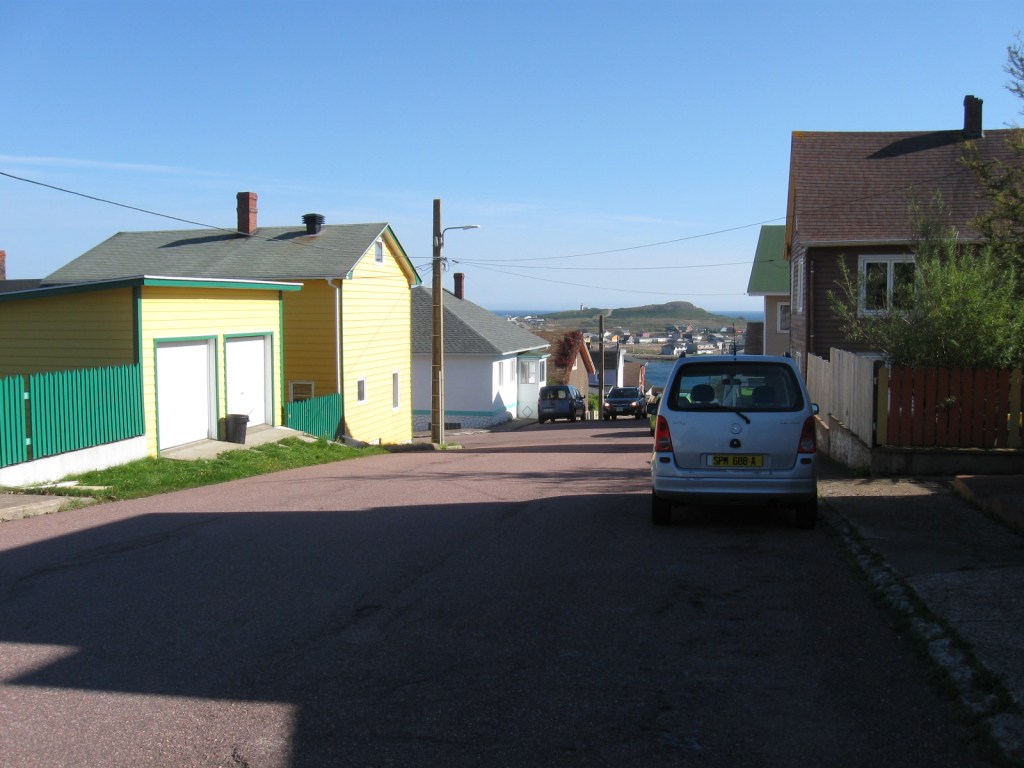 La ville de St-Pierre est quand même d’une certaine envergure, 6000 habitants si j’ai bien compris, et est assez dense. Alors qu’on entre dans le port, on voit des Renault et Citroëns et je sais pas quelles autres sortes de petits chars européens, des drapeaux bleu-blanc-rouge, et une architecture qui fait penser aux villes de bord de mer que j’ai visitées en France. Après m’être fait étamper mon passeport, j’enfourche mon bicycle et je commence à explorer les petites rues, ça prend pas long que je suis rendu en périphérie, puis dans les routes de campagne. En 20 minutes j’ai traversé l’île au complet, je prends une pause au belvédère qui surplombe l’océan puis je redescends la côte vers St-Pierre.