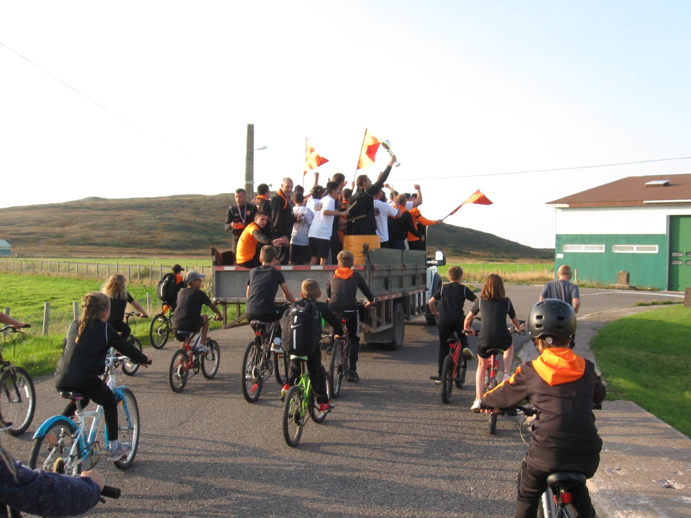 Des gens font des discours, des photos sont prises, des joueurs sont interviewés par la TV locale, puis il y a un genre de buffet avec mousseux ou bière incluse, j’en profite bien. Mais là, le plus cool survient: les joueurs embarquent tous dans un camion flatbed, et une parade commence. Le camion se met à avancer lentement dans les rues du village, suivi de quelques chars qui klaxonnent et d’un gros groupe d’enfants en bicycle. Je me joins à eux. Bin vite je me fais remarquer, le seul adulte dans le convoi de cyclistes, avec un vélo de route strappé de grosses sacoches, et les joueurs me passent des bouteilles de bière, que je cale et que je leur relance.
