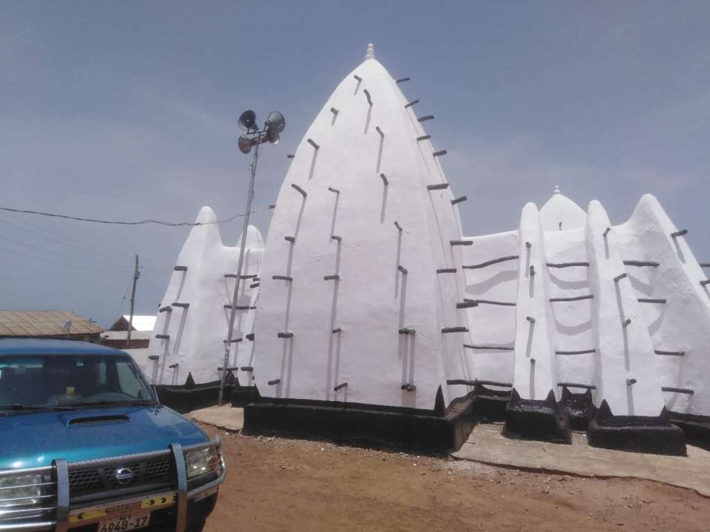 Après ça on a encore le temps de prendre une petite douche, manger le déjeuner inclus avec la chambre, et relaxer, avant de se mettre en route avec un chauffeur employé par le parc. Il passe par la mosquée de Larabanga, une des attractions touristiques premium du pays, comme je vois en loop sur la grosse TV alors que je tape cette histoire quelques jours plus tard, à l’aréoport. En personne elle est plutôt minable, beaucoup plus petite que les drone shots du ministère du tourisme la font paraître, et bien qu’elle date de quasiment 1000 ans, elle est toute reconstruite et peinturée impeccablement blanche avec du ciment clairement moderne. J’ai ce genre de conflit dans ma tête des fois, quand on parle de buildings patrimoniaux: d’un côté, la laisser tomber en ruines est pas nécessairement désirable, mais est-ce qu’on peut au moins essayer de garder son aspect original quand on la maintient?