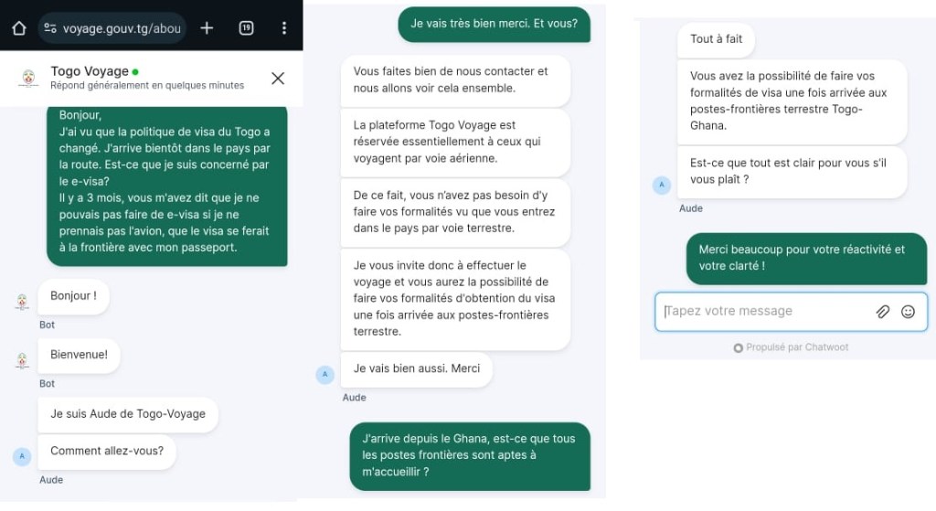 En effet, sur la page de e-visa, ils demandent le point d’entrée, et la seule option est l’aréoport de Lomé. On a donc demandé à leur aide par clavardage, et à notre surprise, ça a répondu tout de suite. Les deux morons regardent ça avec les sourcils froncés, prononçant chaque mot à voix haute. Je m’attends à ce qu’ils concèdent la défaite, et ce serait sans rancune de ma part.