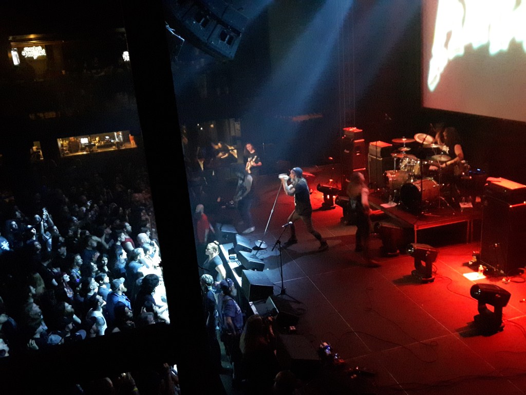 Je rencontre deux Québécois en chemin vers l’autre salle, je reconnais une casquette des Expos et ils aperçoivent la mienne des Capitales. On jase et on commande une bière Yuengling au bar, qui s’avère être une king can de 24 onces. Tout est plus gros aux ‘Tas-Unis. On regarde la moitié du set de MORPHEUS DESCENDS, un foutument bon groupe de death old-school qui mérite d’être vu jusqu’à la fin, mais la façon que le fest est organisé, avec plusieurs salles et parfois des overlaps, il faut faire des sacrifices. Je sais qu’il y aura foule pour Sodom, alors je veux me garantir une bonne place. Même quasiment une demi-heure d’avance, la salle est comble, et j’arrive tant bien que mal à me faufiler sur la rambarde du troisième balcon, à un spot où je vois la scène de côté. Il y a deux gars qui se parlent en une langue bizarre, d’habitude j’ai l’oreille pour identifier les langues étrangères, mais là pour assouvir ma curiosité et passer le temps je leur demande c’est quoi. Il s’avère que c’est un dialecte d’Allemands de montagnes complètement inintelligible avec l’allemand standard, et qu’ils viennent du Liechtenstein!