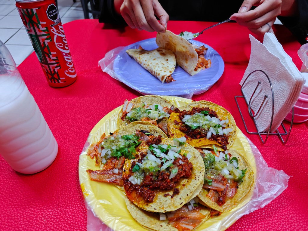 Mais d’abord, tacos. Il y a un stand ambulant juste à côté, avec une pancarte écrite à la main, qui dit chorizo, arrachera, al pastor, bisteck, lechón et pollo. J’en prends un de chaque, et reçois six petits tortillas doublés avec une ligne de viande au milieu, surmontée d’oignons hachés et de cilantro. J’ajoute la sauce verte ou rouge à ma guise, puis je plie ça en deux et envoie ça dans la cale. Osti que c’est bon.